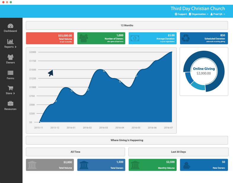 Our easy-to-navigate dashboard is filled with helpful features like quick views of giving statistics. The clear graphs are simple to interpret and break down giving data based on where the donation comes from like online or by text. Access data on new donors, trends, number of donors, average gift amount, and more!