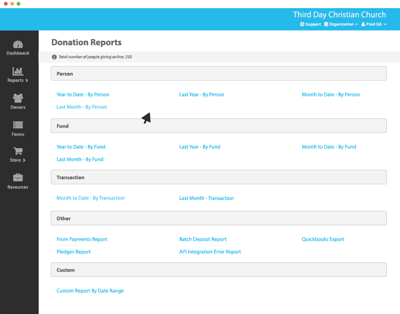 Stay organized and simplify church forecasting with our robust reporting system. View customized reports by transaction, donor, date range, or fund directly from the control panel. Access monthly giving trends, year-to-date totals, and recurring giving data. We can import and export software like ACS, PowerChurch, and QuickBooks. Plus, we’ll add your financial software isn't on our list. We also integrate with popular Church Management Software admins already love using.